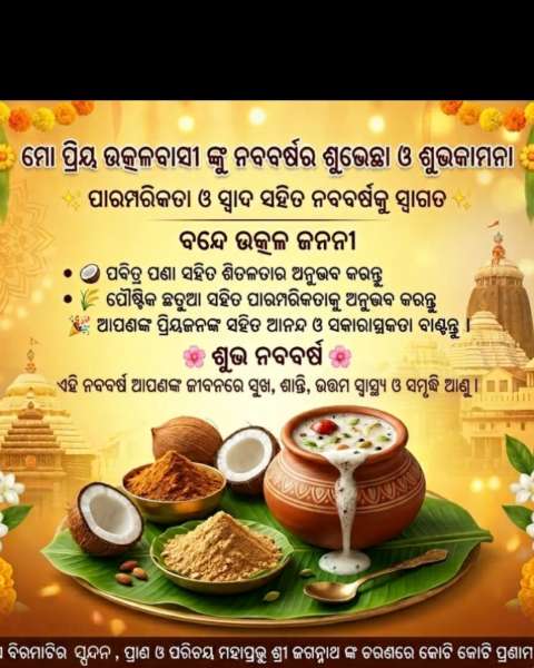 ମହାବିଷୁବ ସଂକ୍ରାନ୍ତିରେ ‘ଓଡ଼ିଆ ନବବର୍ଷ’ ଅତ୍ୟନ୍ତ ଭବ୍ୟ ଭାବରେ ସାରା ରାଜ୍ଯରେ ପାଳନ କରାଯାଉଛି । ଓଡ଼ିଶାର ଜନଜୀବନ ଓ ସଂସ୍କୃତି ସହ ଗଭୀର ଭାବେ ଜଡ଼ିତ ଏହି ଅବସର ହେଉଛି ନୂଆ ଆରମ୍ଭ, ଅପାର ସମ୍ଭାବନା ଓ ସମୃଦ୍ଧିର ପ୍ରତୀକ । ଓଡ଼ିଆ ଏକତା, ଓଡ଼ିଆ ଅସ୍ମିତାର ମହତ୍ତ୍ୱକୁ ଦର୍ଶାଇ ଆସନ୍ତୁ ଗୌରବେ ପାଳନ କରିବା ‘ଓଡ଼ିଆ ନବବର୍ଷ’ ।